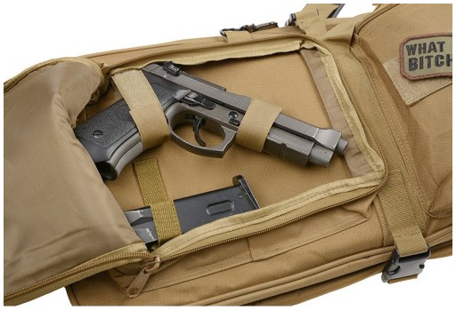 Спереду 3 кишені: 1 для пістолета, оснащена липучками і застібається на двосторонню блискавку, і 2 для магазинів, аксесуарів і запчастин, що закриваються на блискавку. Середня кишеня має липучку для емблем і нашивок.