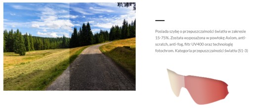 - 15-75% світлопроникності в залежності від переважаючих погодних умов (категорія S1-S3) - лінзи захистять наш зір від інтенсивного сонячного світла та збережуть хорошу видимість під час поганих умов їзди на велосипеді.