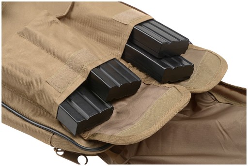 Спереду 4 кишені: 2 для магазинів, застібаються на липучки, і 2 для аксесуарів і запчастин, закриваються на блискавку, а також мають планки для кріплення додаткового спорядження.