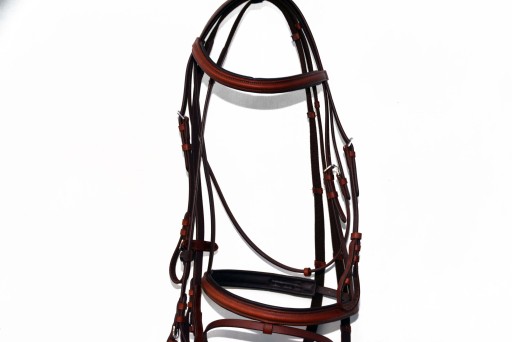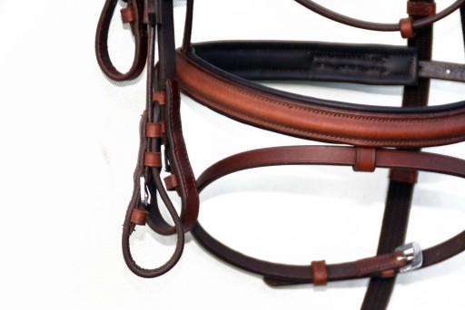 Вуздечка + поводи зі стопорами Анатомічний профільований розмір вуздечки. ПОВНА.Вуздечка виготовлена на шорно-сідельній фабриці у Франції.Виготовлена з натуральної шкіри найвищої якості, дуже м'яка і приємна на дотик, потилична частина і надбрівна смуга обтягнуті м'якою шкірою для запобігання потертостей.Вуздечка застібається і регулюється за допомогою стійкі пряжки, виготовлені з дуже якісної нержавіючої сталі. благородний . Сміливо купуйте Коричневий колір