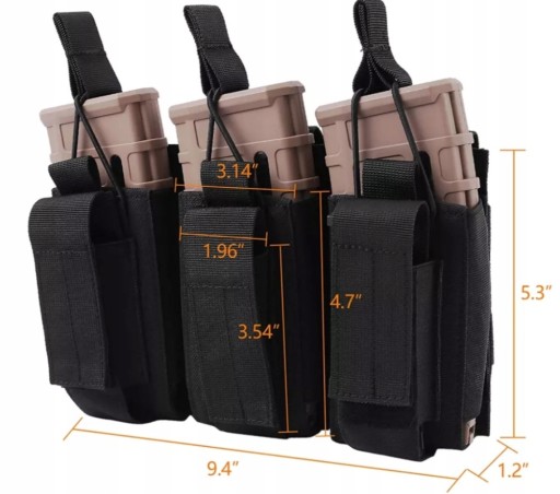 Представлена сумка призначена для зручного носіння магазинів до гвинтівок і пістолетів AR15 або AK47. Частково посилена конструкція дозволяє легко помістити магазин назад у кишеню. Сумка сумісна з системою MOLLE, а також може бути встановлена на поясі шириною до 50 мм. Еластична гума по центру кишені запобігає випаданню магазинів. Фіксація регулюється зручними гумками.