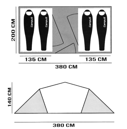 4-місний намет ідеально підходить для сімейних прогулянок або для компанії друзів. Має дві незалежні спальні з вентиляцією, а посередині - між ними - тамбур з підлогою, де можна сховати необхідні під час кемпінгу речі та приладдя. Простирадла та спальні на блискавці для швидкого доступу до внутрішньої частини намету. Намет виготовлено з водонепроникної тканини з покриттям для комфорту в будь-яких умовах. Маленький і легкий в упакованому вигляді (відносно своїх розмірів. Також чудово підійде для кемпінгу, каякінгу. Завдяки унікальним рішенням, які використовуються в наметах Campus, розкидання відбувається дуже ефективно і швидко.