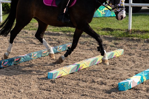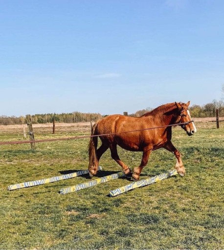Яскраві кольори та візерунки на жердинах (які ми друкуємо самі) чудово задіюють обидві півкулі мозку коня, необхідні для розвитку правильних моделей рухів.