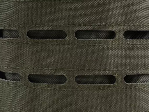 Які характеристики технології лазерного різання? Замість традиційних лямок MOLLE, вшитих зовні рюкзака, у зовнішньому матеріалі за допомогою лазера вирізані спеціальні отвори, через які вплітаються лямки MOLLE кишень і модульних сумок. Спинка і лямки покриті розпірною сіткою для підвищення комфорту при носінні, самі лямки регулюються, а систему перенесення доповнює знімний стегновий ремінь. Стрічки, розміщені з боків і знизу рюкзака, виконують роль компресійних лямок і дозволяють носити додаткове спорядження.