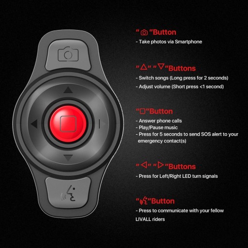 У разі небезпеки або небезпеки натисніть і утримуйте червону кнопку на пульті дистанційного керування на кермі протягом 5 секунд. Додаток Livall автоматично надішле SMS-повідомлення - SOS-сповіщення - попередньо визначеному контакту. Як і у випадку з датчиком падіння, повідомлення міститиме ваше GPS-місцезнаходження.
