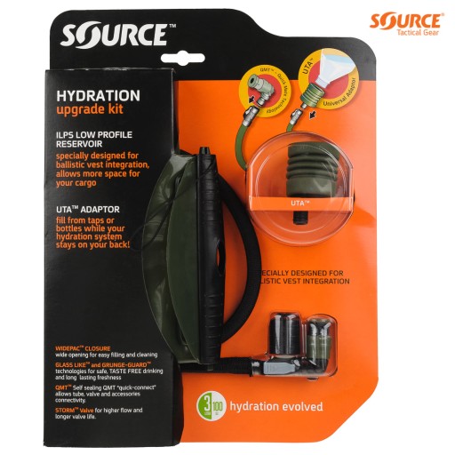 Набір, що складається з сечового міхура 3 л ILPS, трубки зі швидкісними з’єднувачами QMT / SQC, мундштука Storm-Valve і адаптера UTA. Це повний комплект для використання в балістичних жилетах і рюкзаках. Завдяки адаптеру UTA можна наповнити водяний міхур, не знімаючи його з жилета чи рюкзака. Набір упакований в естетичну картонну упаковку - блістер.