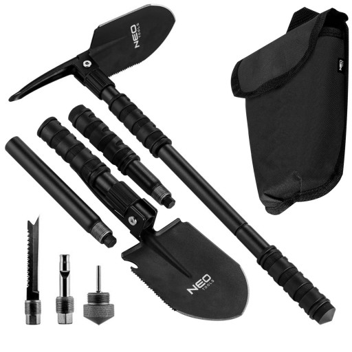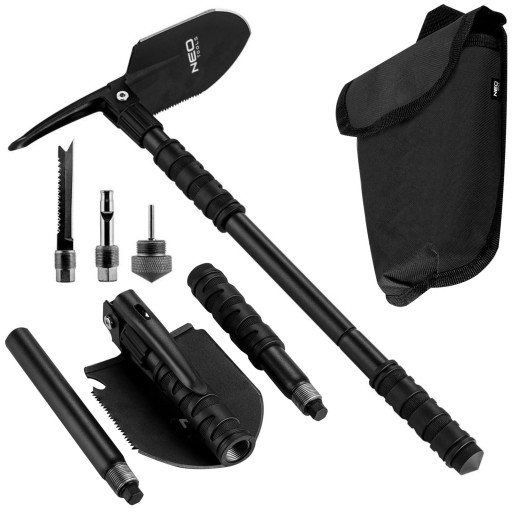 Багатофункціональна лопата для виживання 8 в 1, 63-122, NEO - багатофункціональний інструмент, необхідний для подорожей і кемпінгу. Завдяки додатковим наконечникам, прихованим у ручці, таким як: лопата, пила, кирка, відкривачка для пляшок, розпалювач вогню, багатофункціональний ніж, перфоратор, свисток, він може мати багато застосувань. Підходить для походів, кемпінгу та скаутів. Він допоможе захистити намет від сильного дощу та виконати всі прибиральні роботи в таборі.