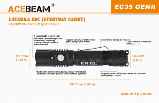 Acebeam EC35 GEN II — легкий і компактний ліхтарик для повсякденного використання (EDC — Everyday Carry), оснащений портом для зарядки типу C.