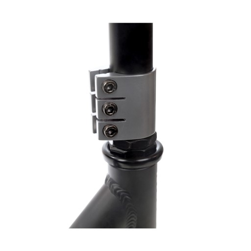 З’єднання керма з вилкою скутера також є важливим питанням. Тому наш самокат серії Raven Evolution оснащений міцним алюмінієвим затискачем, закріпленим трьома кріпильними гвинтами.