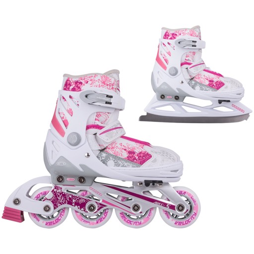 Регульовані роликові ковзани 2 в 1 WORKER Pinkola відрізняються оригінальним дизайном з квітковим малюнком, який неодмінно сподобається жінкам. Крім того, роликові ковзани мають унікальну систему простої заміни гумових поліуретанових коліс на полози. Високоякісні підшипники ABEC 5 забезпечують плавну їзду по льоду з низькою силою тертя і підвищеною стійкістю до сильних вібрацій і нерівностей.