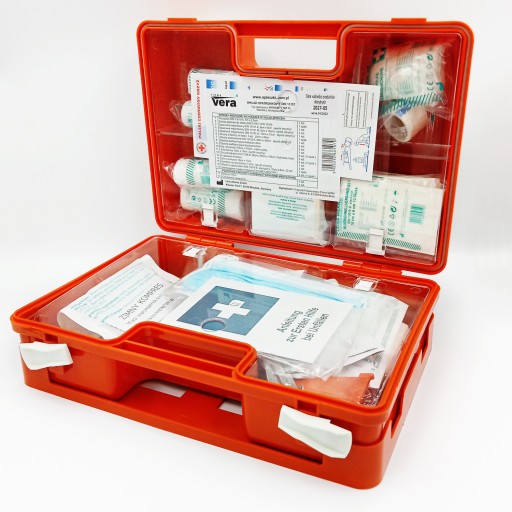 VERA - ПРОМИСЛОВА АПТЕЧКА ДЛЯ КОМПАНІЇ - У КЕЙСУ З ОБЛАДНАННЯМ, ВІДПОВІДНИМ СТАНДАРТУ DIN 13157 - З НАСТІННОЮ РАМОЮ - TOP 15 PLUS