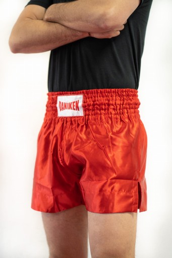 Тренувальні шорти TSB-02 з високоякісного сатину, 100% поліестеру. Повністю червоні шорти з логотипом DANIKEN на талії. З боків мають прорізи, що забезпечує комфорт і свободу рухів під час розкопок. На талії вшита дуже широка гумка - 10 см і шнурок.