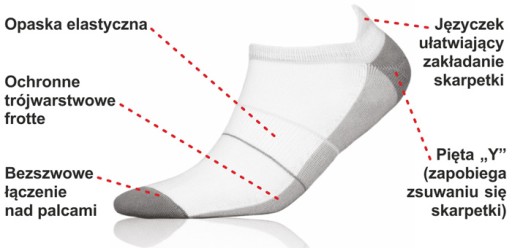 Шкарпетки спортивні з міні верхом (no-socks) - гольфи. Підсилення на п'яті, пальцях і нижній частині стопи амортизують і захищають чутливі частини стопи, схильні до травм і потертостей. Ідеально підходить для занять спортом, дуже зручний, також завдяки використанню приємної бавовни.