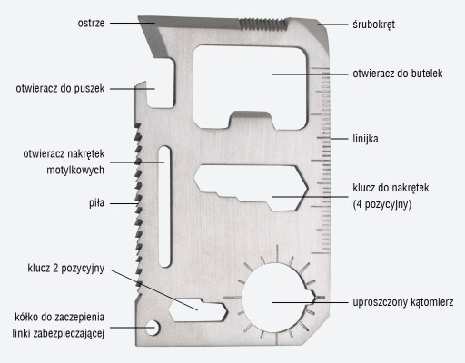 Карта виживання ідеально підходить для активних людей. Завдяки невеликому розміру ми завжди можемо мати його з собою - він поміститься в нашому гаманці. Цей інструмент може полегшити наше життя в різних ситуаціях, він стане в нагоді кожному велосипедисту, рибалці, туристу чи любителю саморобки.