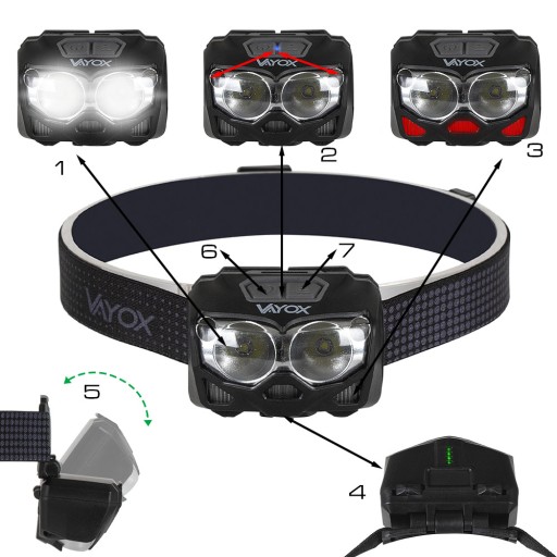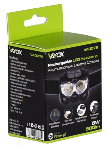 - Акумулятор 3,7 В, кабель usb-c, ліхтарик VA0078, пов'язка на голову, оригінальна упаковка