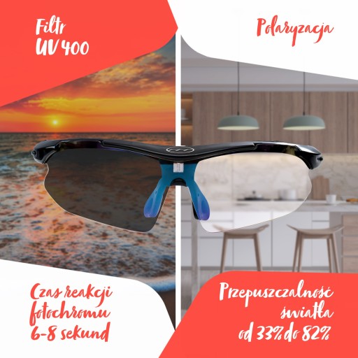 Фотохром подбає про відповідний рівень затемнення ваших окулярів, поляризаційний фільтр запобіжить будь-які відблиски від поверхонь, таких як: вікна, вода, а УФ захистить ваші очі від сонячного випромінювання.