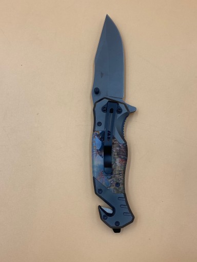 Лезо з нержавіючої сталі має логотип компанії. Лезо оснащене штифтом, що полегшує відкриття ножа однією рукою.