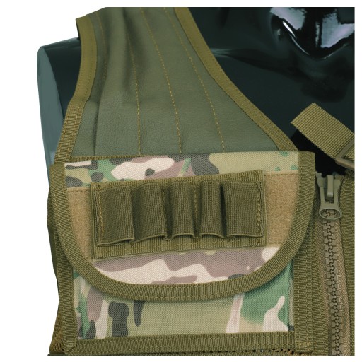 Тактичний жилет розділений на дві частини і застібається на блискавку. Права сторона оснащена кишенею з органайзером і липучкою для нашивок і трьома сумками стандарту STANAG. Надплечовий ремінь оснащений протиковзким затильником. З лівого боку розташовані чотири універсальних підсумки для магазинів, кобура для кожної моделі пістолета з підсумком під магазин і один стандартний підсумок STANAG. Кобура знімна. Всі мішечки застібаються на липучку.