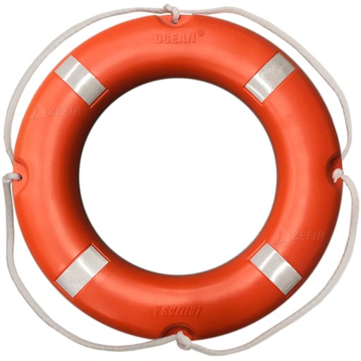 Рятувальний круг з морським сертифікатом. Він має світловідбиваючу стрічку та мотузку навколо колеса. Сертифікат штампується на колесі та додається письмово.