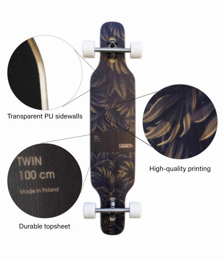 Його конструкція робить його фантастичним для їзди містом - профіль розвалу разом із легким увігнутим гарантують чудове відчуття дошки, а отже, підвищений комфорт їзди завдяки своїй маневреності. Подвійний наконечник — це форма, створена для трюків, тоді як серцевина з тополі та ясена, поліуретанові бічні стінки та конструкція зі скловолокна надають лонгборду Switch надзвичайної гнучкості, зберігаючи надзвичайно міцну конструкцію. Траки з верхнім кріпленням дозволяють знизити центр ваги на дошці, що робить натискання на ній набагато менш стомлюючим, ніж у випадку з дошками з вантажівками з нижнім розташуванням.