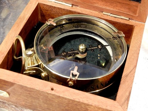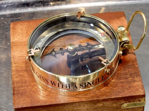 Красива копія пристрою від британської компанії Spencer & Co. з 1905 р. З одного боку компас, з іншого лупа — прилад використовувався для читання деталей карт. По краю напис англійською: «Подорож у тисячу миль починається з одного кроку»