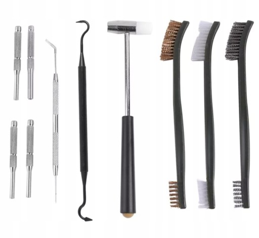 Пакет включає: 10 шт./комплект щітки для чищення зброї, молотка, перфораторів з футляром для транспортування