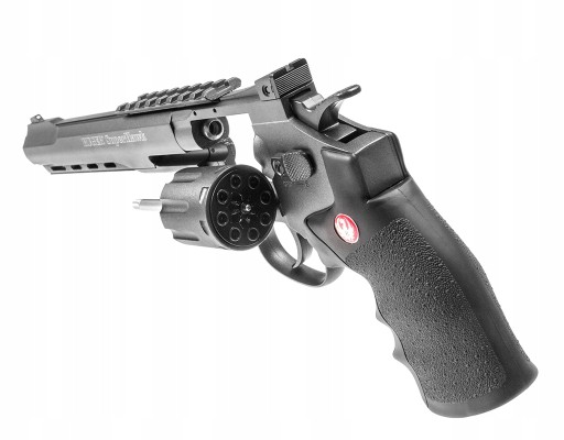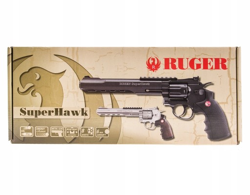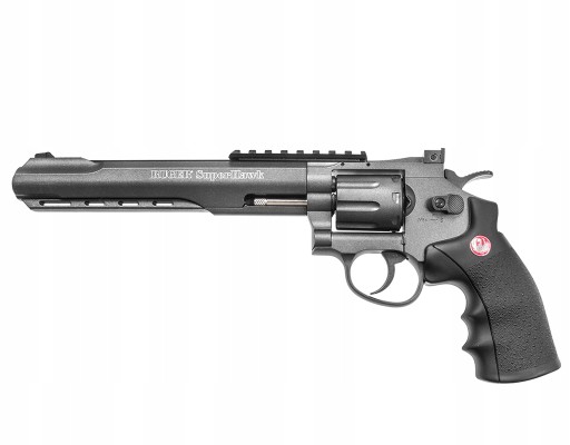 Важка, суцільнометалева, ліцензована копія револьвера Ruger Superhawk 8", що працює на газі CO2 з 12-грамовим патроном, розміщеним у рукоятці, що створює початкову швидкість 630 FPS. Револьвер має ліцензію Sturm, Ruger & Company, Inc. маркування.