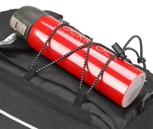 - Як і у верхній частині сумки, у зовнішній кишені пляшка утримується шнурком.