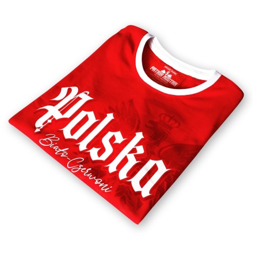 Червоний колір матеріалу в поєднанні з великим написом: Poland, написаним елегантним та оригінальним готичним шрифтом, є ідеальною пропозицією для кожного патріота, який любить Польщу та хоче чітко підкреслити свою прив’язаність до нашої батьківщини. Напис виконано на фоні орла, врізаного в колір футболки, що символізує, серед іншого, мужність і силу. Футболка також буде ідеальною для найвідданіших уболівальників відомих у всьому світі польських спортсменів, які з великим успіхом представляють нашу країну в таких дисциплінах як: футбол, волейбол, гандбол, спідвей, велоспорт, боротьба, бокс, ММА. , теніс, стрибки з трампліна та багато інших.