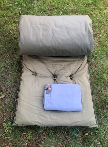 Товстий матрац військового типу (з малюнком). Розміри в розкладеному вигляді: 195 см х 70 см. Верхня частина матраца виконана з бавовни. Матрац наповнений теплоізоляційним матеріалом і дуже товстий, приблизно 8 см. Він має ремінці на кінцях, які дозволяють його згортати.