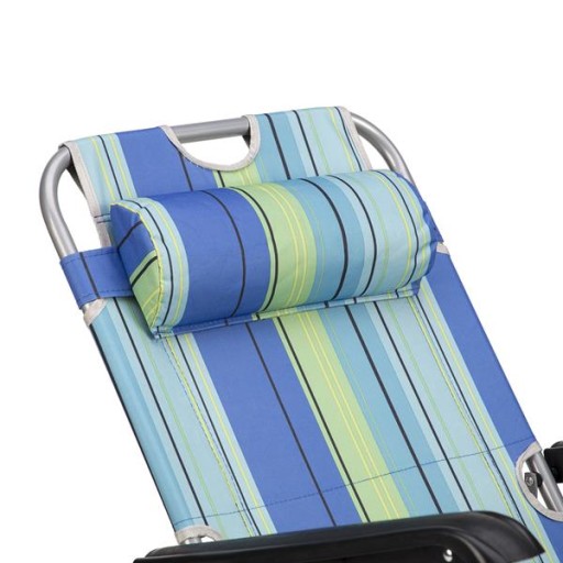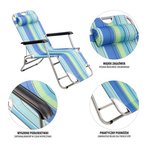 Це ідеальний компаньйон для поїздок на пляж, але, звичайно, він також підійде в саду чи кемпінгу. Це універсальний шезлонг, який працюватиме в будь-яких умовах і на будь-якій місцевості. NC3024 — складна модель, тому ви легко можете взяти її з собою в подорож. Лежак можна встановити в двох положеннях. Перший - це положення лежачи, яке дозволяє засмагати як на спині, так і на животі. Приваблива позиція, особливо для людей, які не люблять лежати прямо, напр. Друге положення - положення сидячи. Його можна використовувати для прийняття сонячних ванн, але його також можна використовувати за кемпінговим столиком. Комфорт обох положень доповнюється подушкою, яку можна вільно пересувати та регулювати відповідно до ваших потреб.