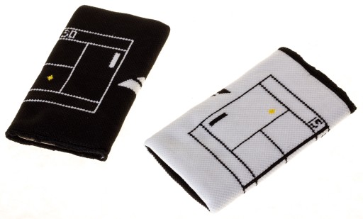 Двосторонній браслет, чорний з білими лініями корту з одного боку, білий з чорними лініями корту з іншого. Він запобігає стікання поту з ваших рук на ручку ракетки і допоможе витерти піт з чола. Новий матеріал, який швидко сохне і менше віджимається руками.
