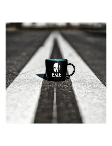 Кружка ємністю 350 мл, виготовлена з порцеляни. На ньому вигравірувані логотипи PMF, один з яких непомітний на перший погляд. Зовні кухоль чорний, а всередині синій. Ми спеціально персоналізували картонну упаковку відповідно до супровідного повідомлення HOLD THE LINE.