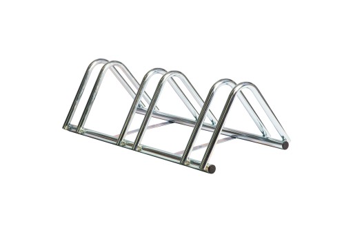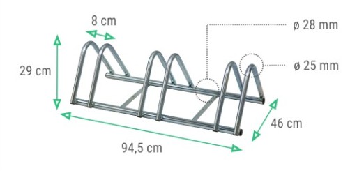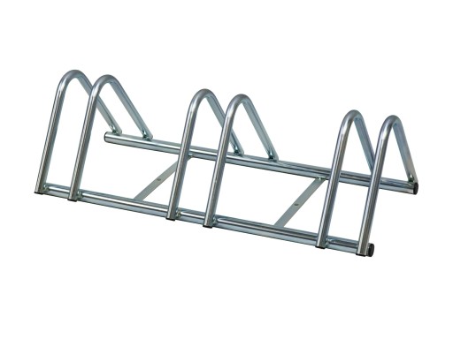 Зварна та оцинкована стійка на 3 велосипеда, виготовлена з верхніх труб діаметром 25 мм та опорних труб діаметром 28 мм.