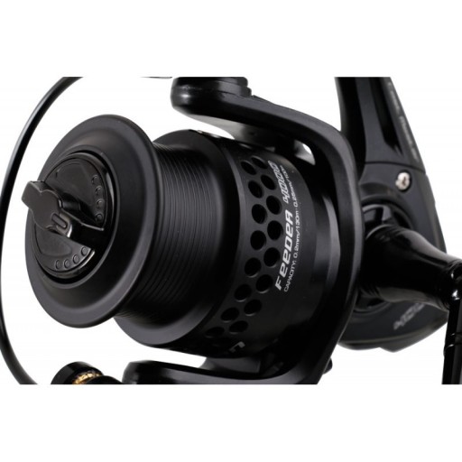 Котушка присвячена фідеру та метод фідеру. Корпус і ротор виготовлені з міцного пластику, ручка - з алюмінію. Неглибока, широка, злегка конічна металева шпуля сприяє далеким закиданням.