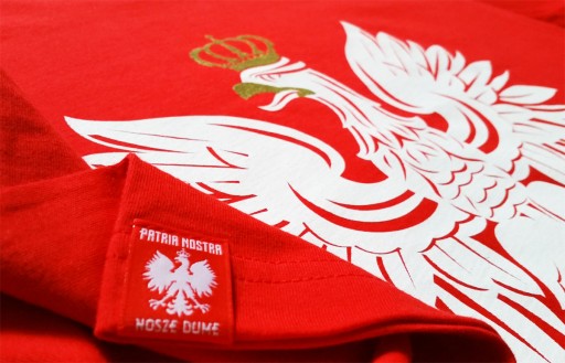 Інтенсивний червоний колір матеріалу в поєднанні з гордим білим орлом із золотою замкнутою короною, увінчаною хрестом, є ідеальною пропозицією для кожного патріота. Гордість, виражена поєднанням національних кольорів, а також простота і пряме послання візерунка надають йому унікального характеру.Друк на лицьовій стороні виконано різними типами фарб для трафаретного друку. Щоб додатково підкреслити гордість польського білого орлана, ми використали золоту фарбу (глітер), що надає ефект блиску. Для найкращого відтворення та інтенсивності білого кольору ми вирішили нанести 2 шари фарби.