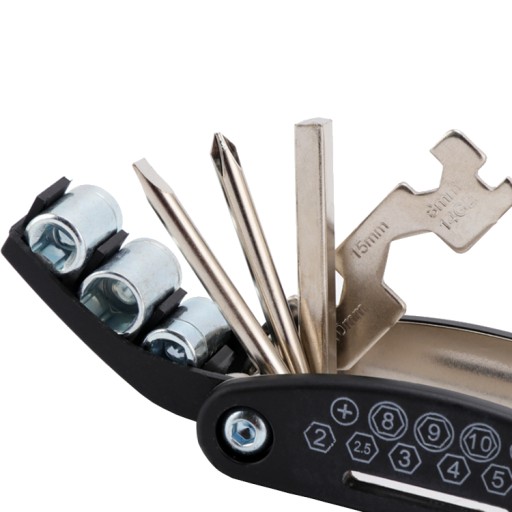 Універсальний велоключ – це товар, який обов’язково має бути у вашому спорядженні під час подорожі чи велоподорожі. Завдяки невеликому розміру він поміститься практично в будь-якій кишені та сумці. Набір складається з 16 найважливіших інструментів для ремонту та налаштування велосипеда. Це шестигранні ключі, викрутки, розетки з перехідником, а також плоскі та спицеві ключі.