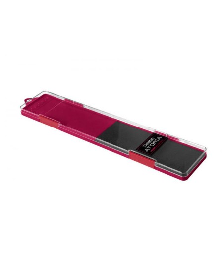 Delphin ATOMA — коробка для лідерів. Це практичний ящик для зберігання готових наборів, які повинні знайти своє місце у вашому рибальському спорядженні. Ця плоска коробка виготовлена з пластику. Її нижня частина червоного кольору оснащена невеликими шпильками, а інша частина має пінопласт EVA, до якого можна прикріпити гачки. Верхня частина виготовлена з прозорого пластику для кращої видимості ваших комплектів. Кришка закривається двома вбудованими затискачами.