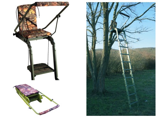 Практична драбина з сидінням і підставкою для рушниці для мисливців. Завдяки малій вазі і складності його можна використовувати буквально скрізь. Надзвичайно стійка конструкція, що підтримується «зубами», що спираються на дерево, і додатковими ременями. Сидіння покрите 100% поліестером з м'якою губкою, матеріал кольору камуфляж, нековзка підніжка. Вся пофарбована зеленою антикорозійною фарбою.
