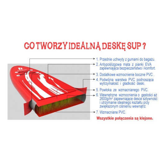 • Виготовлений з посиленого матеріалу з технологією drop stitch, що робить дошку надзвичайно жорсткою в надутому стані