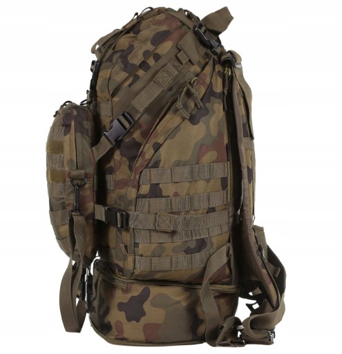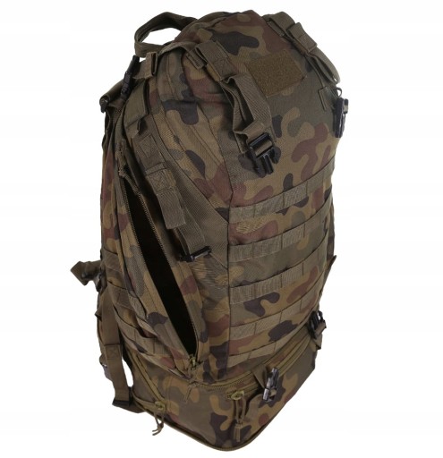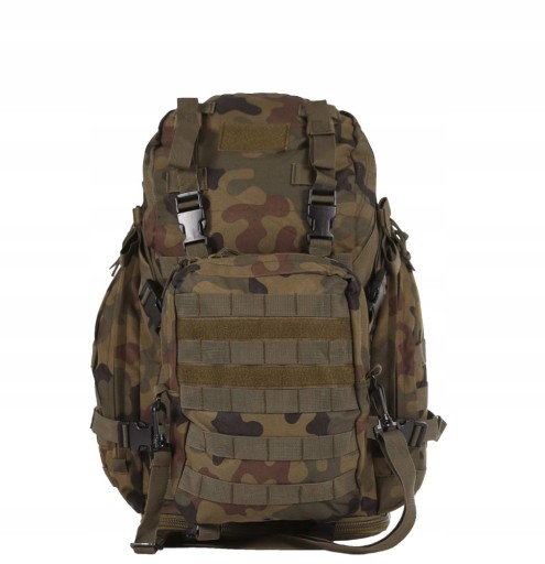 Виготовлений з водонепроникного нейлону 600D PU з високою зносостійкістю. Закривається на міцні блискавки з металевими бігунками. Двосторонні закриті кавомашини - спеціальна конструкція з використанням ущільнювальних смужок підвищує водонепроникність. Блискавки оснащені ланками для легкого відкриття. Дуже зручна система перенесення. Спинка оббита м'яким нейлоном і товстим поролоном. Жорстка пластина і алюмінієва шина створюють каркас, який допомагає розвантажити хребет. Каркас поміщається в спеціальну кишеню - можна повністю зняти ребро жорсткості або саму рейку. Широкі регульовані лямки з м'яким поролоновим наповнювачем, укріплені стрічкою. Оснащений D-кільцями для кріплення підручних предметів. Система швидкого зняття рюкзака QR (Quick Release). Динамічний нагрудний ремінь адаптується до положення і рухів користувача, оснащений регулюванням по висоті і довжині. Широкий стегновий ремінь для повної стабілізації рюкзака під час бігу або повзання. Пояс оброблений стрічками модульної системи MOLLE, застібається на суцільну пряжку. Можливість від'єднати поясний ремінь і використовувати його як ремінь для спорядження. Передня, бічна і нижня панелі оснащені лямками модульної системи MOLLE 25 мм - можливість кріплення додаткових кишень. Система компресійних лямок для зменшення габаритів рюкзака також захищає від переміщення вантажу. Рюкзак оснащений верхньою ручкою для перенесення або підвішування - евакуаційною ручкою. На клапані пришита липучка для нашивки Morale Patch або відбивачів у системі друг-незнайомець. Внизу є стрічки для кріплення, наприклад, спальників. Рюкзак оснащений прозорою іменною кишенею. Заклепки-стоки для відведення рідини зсередини рюкзака в разі затоплення.