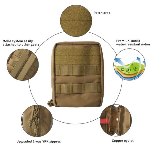 Медична сумка - Hard-Skin System Molle First Aid Aid Kit - Coyote (HS-TL-071-1-TAN) - ідеально підходить для парамедиків, тактичних і військових операцій, працівників охорони здоров'я та безпеки, а також для екскурсій або заходів на відкритому повітрі. Він виготовлений з міцного та міцного нейлону 1000D. Характеризується високою якістю, малою вагою (300 г) і невеликими розмірами (35 х 25 х 2 см). Сумка оснащена панеллю MOLLE, панеллю Velcro та двосторонніми блискавками YKK.