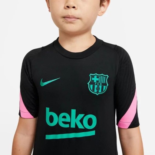 Нова футболка NIKE JR FC BARCELONA STRIKE чорного кольору з рожевими та бірюзовими елементами. З правого боку тулуба вишитий бірюзовий логотип NIKE, зліва — логотип ФК «Барселона», спереду — бірюзовий напис BEKO, звичайна спинка. Футболка стандартного крою. Виготовлений з матеріалу технології DRI-FIT, який забезпечує сухість, відводячи піт від шкіри.