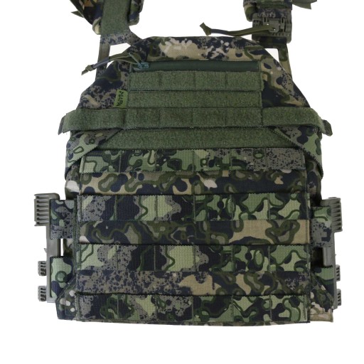 Обшивка жилета покрита лямкою MOLLE в камуфляжі MAP. Це також дозволяє приєднати будь-яке обладнання зі складанням у цьому стандарті. Лямки на нагрудній панелі додатково покриті липучками. петля. Ззаду на жилеті є широка аварійна ручка. Зсередини жилет обшитий темно-зеленою розпірною сіткою. Для підвищення комфорту при носінні тактичний жилет оснащений двома комфортними накладками зі стрічками для кріплення кабелів.