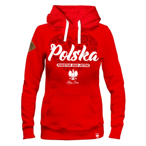 Інтенсивний червоний колір матеріалу в поєднанні з білим домінуючим написом: Polska, виконаним стильним, але водночас розбірливим шрифтом, є ідеальною пропозицією для кожного патріота. Нижче красномовне гасло «Я пам’ятаю, звідки я», яке нагадує нам, що гордість і національне почуття не залежать від того, де ми живемо. Ми також тонко позначаємо близький нам символ коронованого орла, прикрашений каліграфічним написом зі слоганом нашої компанії: «Я ношу гордість». спосіб друку. Для найкращого відтворення та інтенсивності білого кольору нанесено 2 шари фарби. Тло візерунка – це суміш елементів, які переважно символізують народний характер, притаманний польській ідентичності. Виготовлені бордовою фарбою, вони оформлені у формі серця, зі смаком вписуючись у колір матеріалу та додатково підкреслюючи любов до Батьківщини.