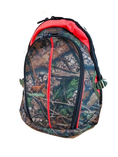 Зручний двокамерний рюкзак для полювання з водонепроникної тканини з просоченням Cordura камуфляжного кольору зі світло-помаранчевими вставками. Застібається на товсту блискавку. Ідеально підходить для колективного полювання. Має посилену спинку і лямки, патронташі в невеликому відділенні. Дно рюкзака закріплено пластиковими основами типу «їжачки», на лямці вшита світловідбиваюча стрічка. На рюкзаку дрібна декоративна мисливська вишивка.
