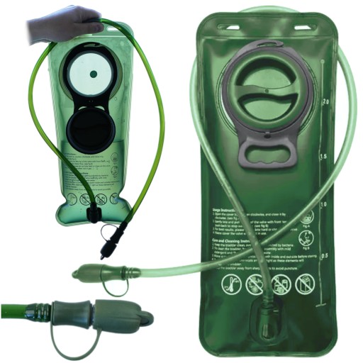 2-літровий гідратаційний картридж, який дозволяє легко зволожувати ваше тіло під час ходьби, бігу на довгі дистанції, альпінізму або їзди на велосипеді. Використовується любителями туризму та спорту, військовими ентузіастами, солдатами та ентузіастами командних ігор, таких як пейнтбол або ASG. Його ємності вистачає до 5 годин. Клапан на трубці зі зручною системою ON / OFF дозволяє працювати однією рукою. Досить також відкусити і посмоктати трубку без використання рук. Конструкція вкладиша дозволяє носити його і розміщувати де завгодно, наприклад, повісити на стіну, покласти в рюкзак. Оснащений мірним стаканом, завдяки якому ми можемо контролювати кількість випитої води. Сечовий міхур виготовлений з нетоксичного, гнучкого ТПУ поліуретану без запаху. Підходить для використання при температурах від -20 ℃ до 50 ℃. Легко наповнювати та обслуговувати - система відкривання, завдяки ковпачку 8 см, дозволяє легко наповнювати та чистити резервуар. Всередині гідратаційний міхур має гладку поверхню, яку можна швидко помити. У спекотні дні можна запросто кидати кубики льоду.