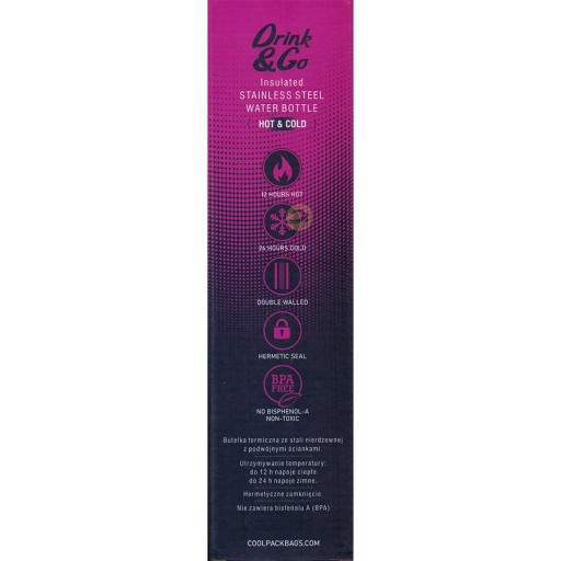 Подбайте про своє здоров'я та зволоження з термосом Drink & Go від Coolpack. Відновлення рідини в організмі надзвичайно важливо, і тепер це може бути дуже легко! Зручний, місткий і міцний. Пляшка виготовлена з двостінної нержавіючої сталі і відмінно збереже температуру напою - низьку (24 години) або високу (12 годин). Затвор закручується і має герметичність. Термос Drink & Go від Coolpack чарівних пастельних кольорів вміщає 500 мл рідини.