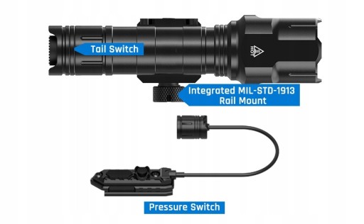 Ліхтарик оснащений кнопковим перемикачем і дистанційним реле тиску. Керування однією рукою в миттєвому режимі, режимі змінної інтенсивності або режимі стробоскопа для різних тактичних потреб.