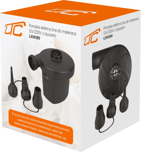 Універсальний і функціональний електричний насос LTC характеризується широким спектром застосування, незалежно від того, перебуваєте ви вдома чи в гостях. Електронасос обов'язковий для кожного курортника. Висока потужність, укладена у відносно невеликому корпусі, є двома найбільшими перевагами цього пристрою. Виріб не займає багато місця в багажнику, а завдяки високим параметрам швидко надує всі водні іграшки, понтони або максимально великий матрац. Насос поставляється з 3 наконечниками різного діаметру (6 мм, 17 мм, 23 мм), які допоможуть вам легко надувати маленькі та великі предмети.